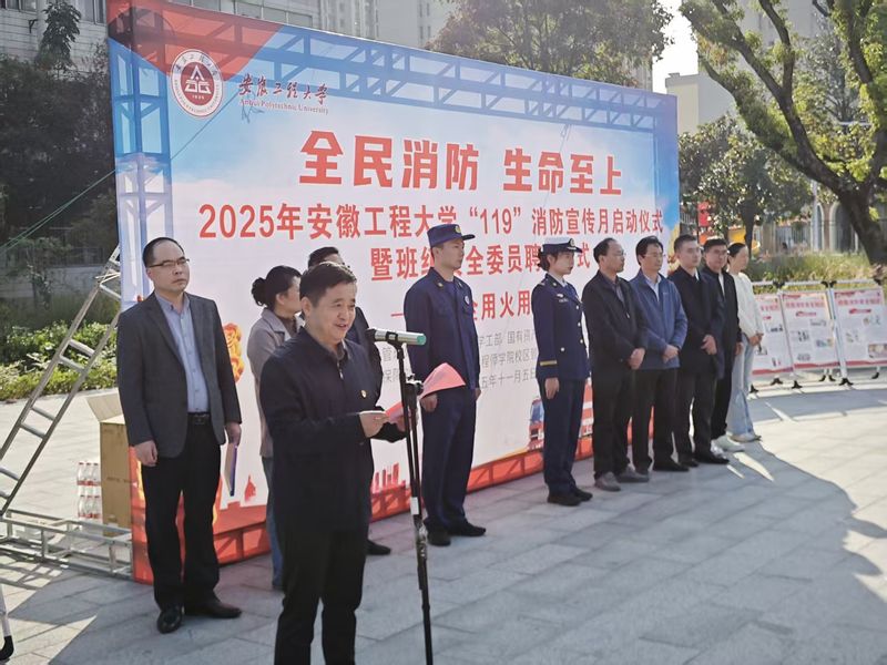 活动现场介绍了2025年学校119消防宣传月系列活动方案,宣读了《关于聘任胡汁楷等192名同学为安徽工程大学校园安全委员的决定》,安全委员代表生制252班甘霖同学作了发言。