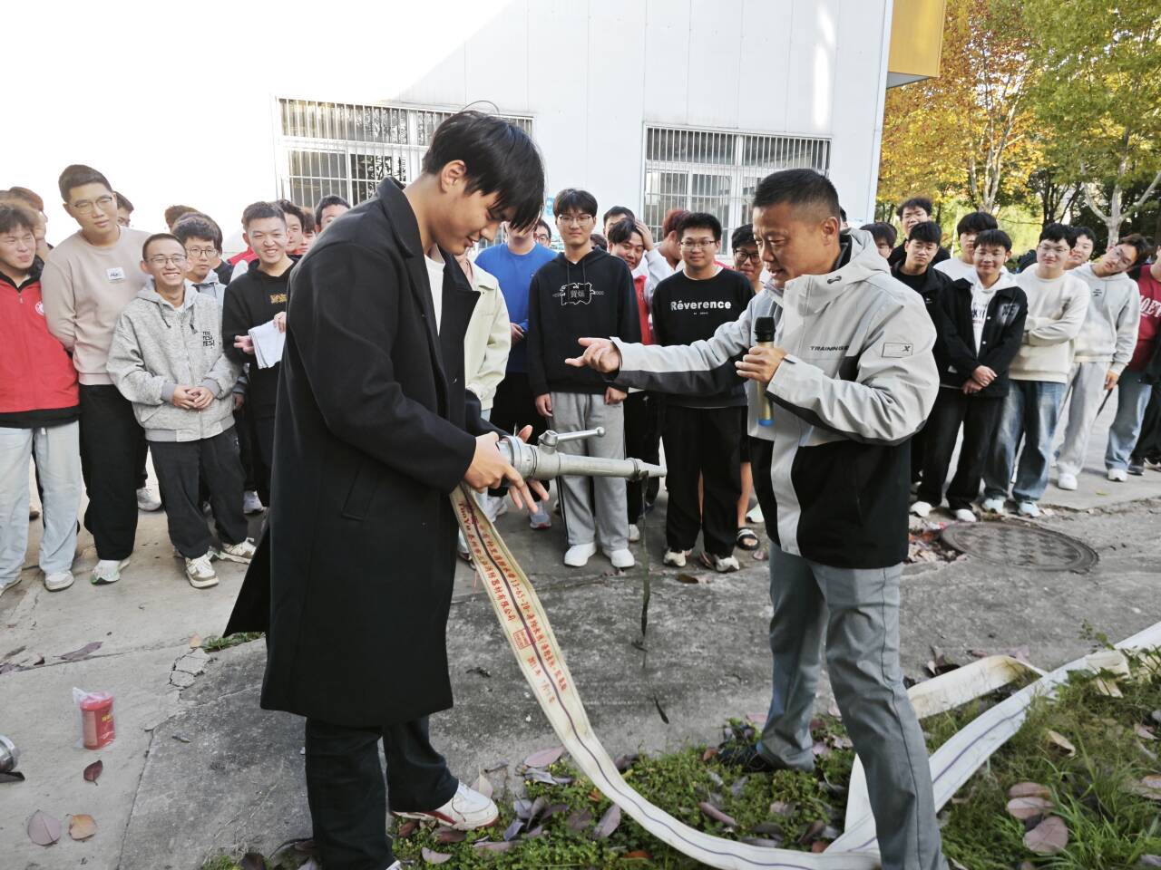 在安全集结区域,安全管理处李岗老师对疏散过程进行了简要点评,并重点就宿舍消防安全特点、违规电器的危害、初期火灾的扑救、灭火器与消防栓的使用方法以及火场逃生自救技巧等进行了深入浅出的讲解。为了让同学们获得更直观的体验,现场还设置了消防栓实操体验环节,学生们踊跃参与,轮流使用消防栓,亲身体验了如何对模拟火源进行有效扑灭。
