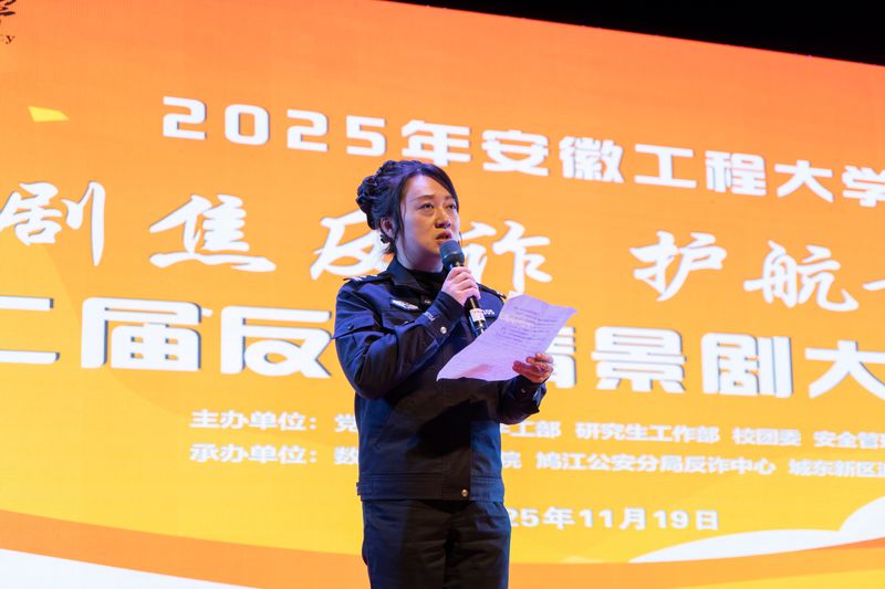 11月19日,学校第二届“剧焦反诈 护航青春”反诈情景剧大赛决赛在师生活动中心大礼堂成功举行。经过激烈角逐,《贵人》《爆裂无声》荣获一等奖,《皇帝,您醒醒啊!》等3个节目获二等奖,《九月围城》等5个节目获三等奖,另有23部作品获优秀奖。校党委常委、副校长张开炳,鸠江公安分局党委委员、副局长佘辉出席活动。市公安局刑侦支队电信网络犯罪侦查大队、城东新区派出所负责人,校党委宣传部、学工部、研工部、校团委、安全管理处和数理与金融学院负责人及各学院师生代表共1000余人观看了比赛。