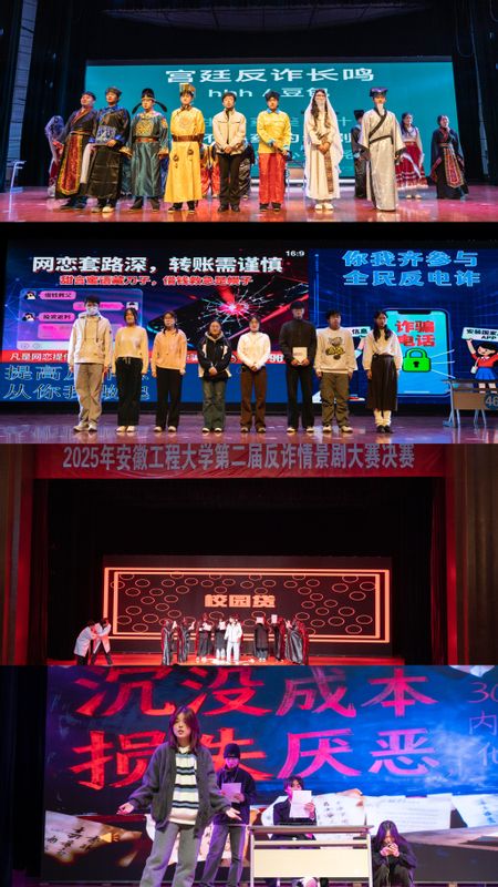 本次大赛将反诈主题巧妙融入情景剧创作。《“薪”花怒放?一“聘”入狼窝》以大学生被骗经历为主线,实现反诈警示与现实教育相结合;《皇帝,您醒醒啊!》创新融合“反诈模拟器”与“古代宫廷穿越”元素,增强了趣味性与沉浸感;《三打白骨精》对经典IP进行创新改编,使观众在趣味演绎中识别骗局套路;《折价“良缘”》还原校园诈骗链条,揭示防骗要点;《诈诈诈,我诈你》通过“以骗治骗”的反转设计强化警示效果;《循环梦境》以“亲身试错”与“梦醒复盘”相结合的方式提升观众代入感;《九月围城》讲述新生受骗经历;《贵人》揭露诈骗中利用“赌性”与从众心理的套路;《迷途》展现“连环套路+情感操控”的校园诈骗危害;《爆裂无声》以富有张力的故事和新颖题材敲响反诈警钟。