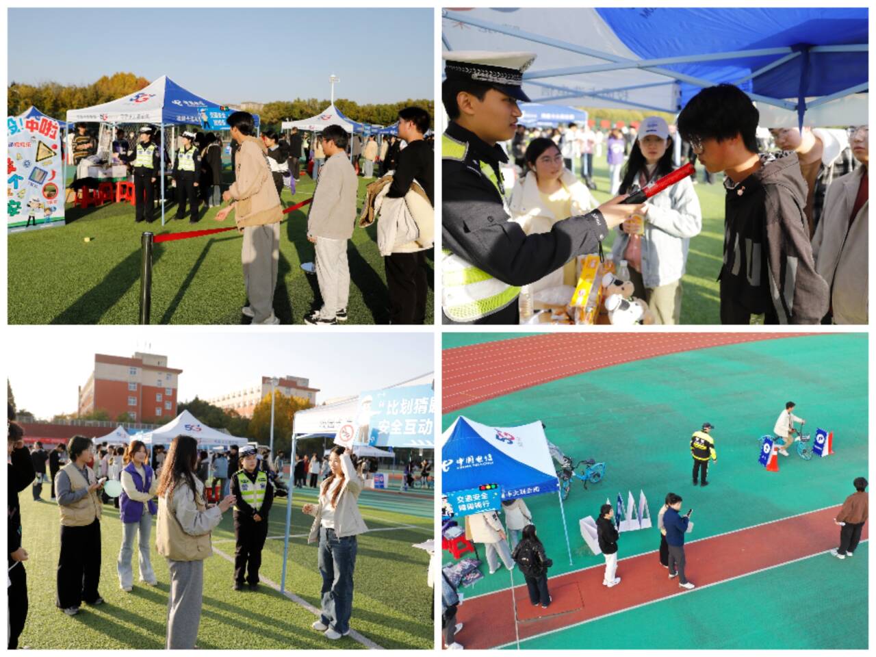 为增强教育实效,本次活动创新设计了“趣味互动+主题体验”的立体化活动模式。现场设置的交通安全接力赛、自行车障碍赛、砸沙包赢奖品等互动项目,将交通规则知识融入趣味竞技中,让同学们在轻松的氛围中巩固交通常识,现场参与热情高涨。同时,学校联合交警部门精心打造“酒精快检护平安”“学好标牌·文明出行”“头盔护顶·平安骑行”三大主题展台,通过酒精模拟检测体验、交通标志现场答题、头盔正确佩戴教学等沉浸式体验项目,帮助同学们直观掌握交通安全技能,切实提升自我保护能力,活动现场学习氛围浓厚,教育效果显著。