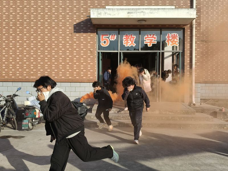 随着一声哨响,演练正式拉开帷幕。教学楼瞬间弥漫起由专业烟雾弹制造的无害浓烟,高度模拟真实火场环境。参演新生立即反应,迅速用自备的湿毛巾或纸巾捂住口鼻,在楼层安全志愿者清晰、镇定的引导下,严格按照预定的疏散路线,采取低姿弯腰的方式,快速、有序地从各楼层向室外安全地带撤离。整个疏散过程紧张而不慌乱,人流顺畅,200余名参演学生在2分钟内安全抵达指定集结地点。