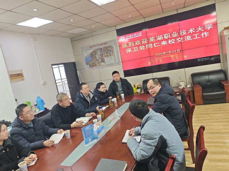 1月23日,芜湖职业技术大学保卫处负责人彭伟松一行七人来校调研交流校园安全管理工作。我校安全管理处负责人及相关科室负责人参加座谈交流。